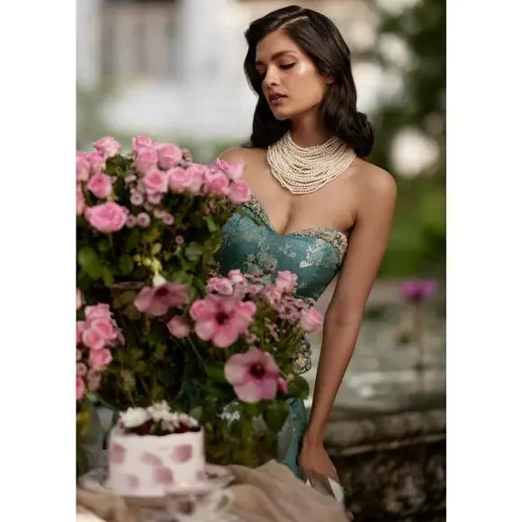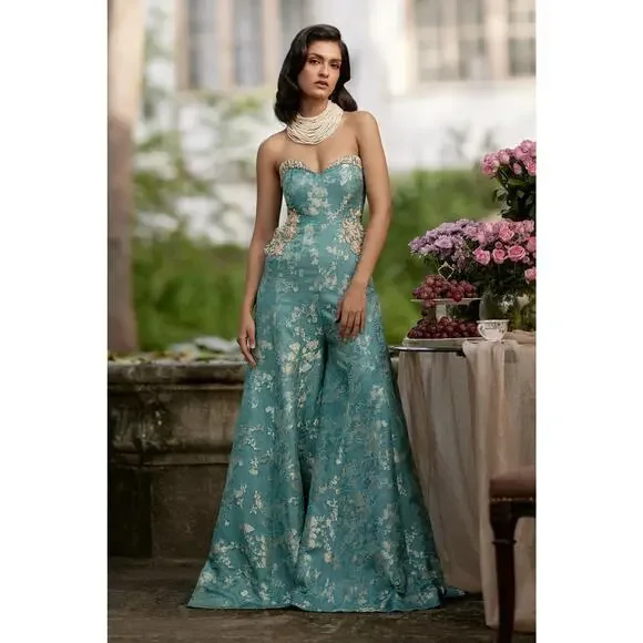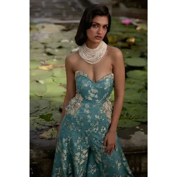 Featuring a stylish floral motif, padded front, and Zardozi embellishment at the neckline. Crafted from self-woven Russian silver jacquard with a fitted bust and waist, sleeveless silhouette, and flared hem. Back zip closure and functional side pockets. Material: Russian Silver Jacquard. Fits true to size, order your normal size